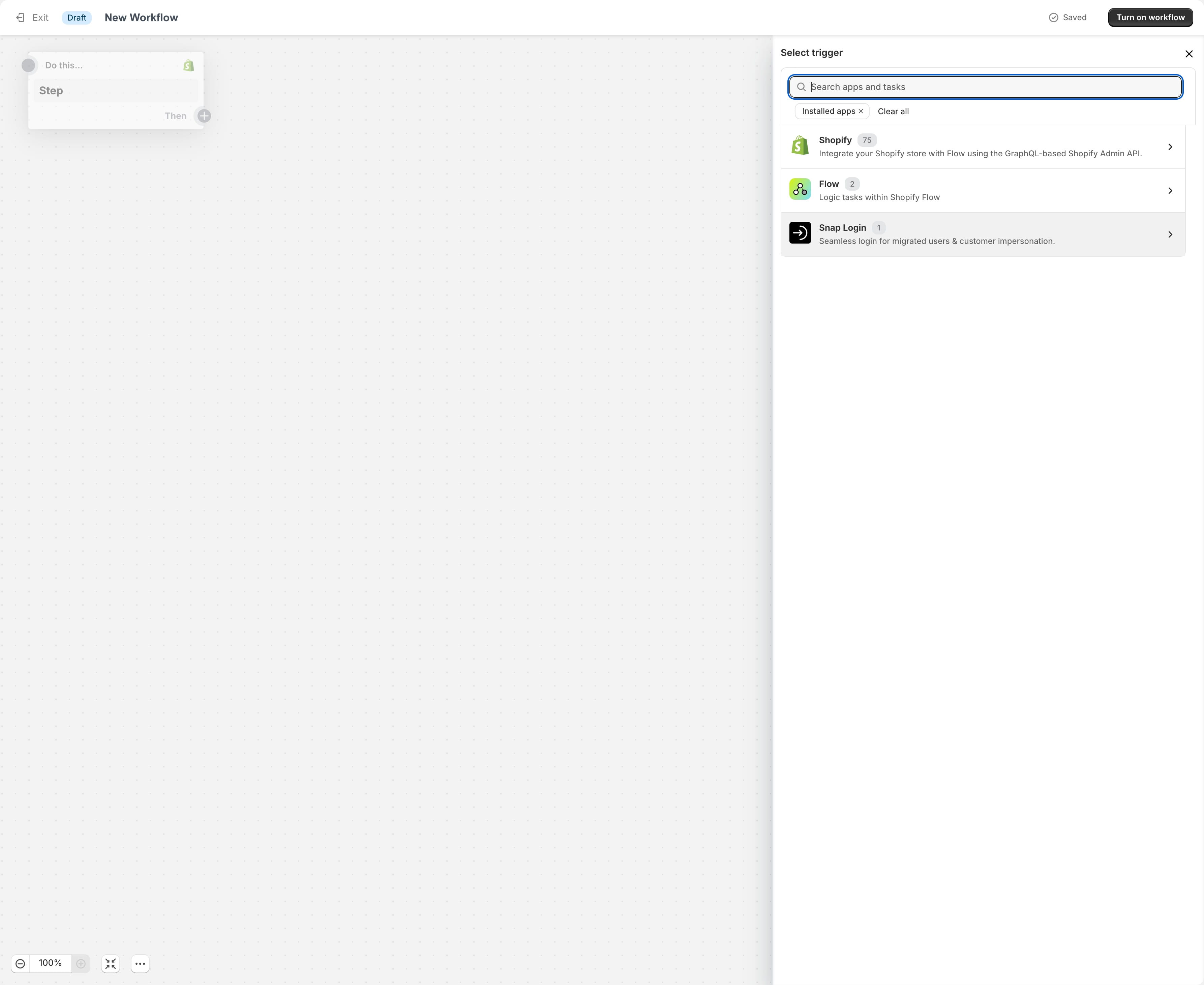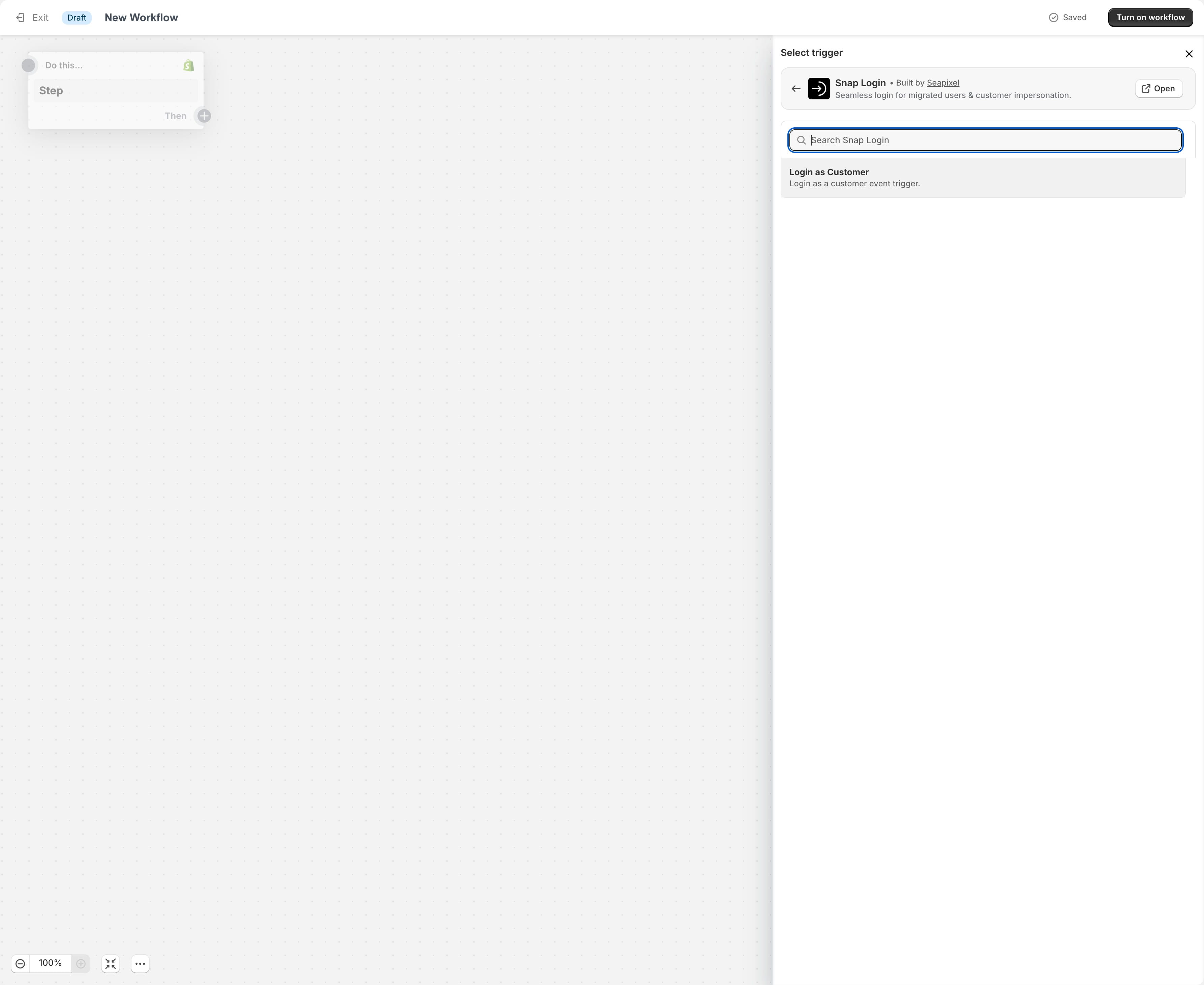 To set up this new workflow, start by selecting a trigger. Find the "Snap Login" app and click to select it.