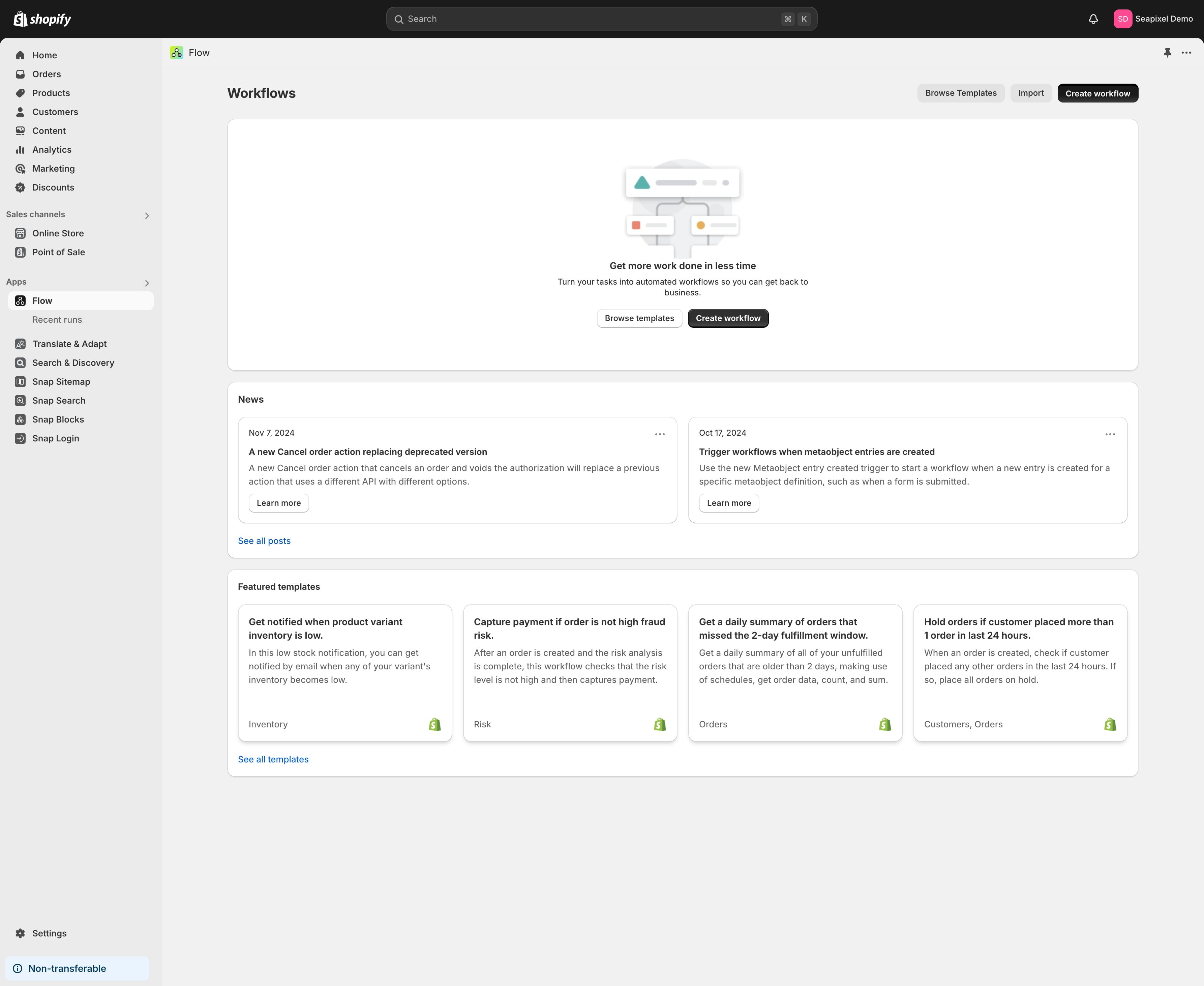 Open the Shopify Flow app and create a new worflow by clicking at the "Create workflow" button.