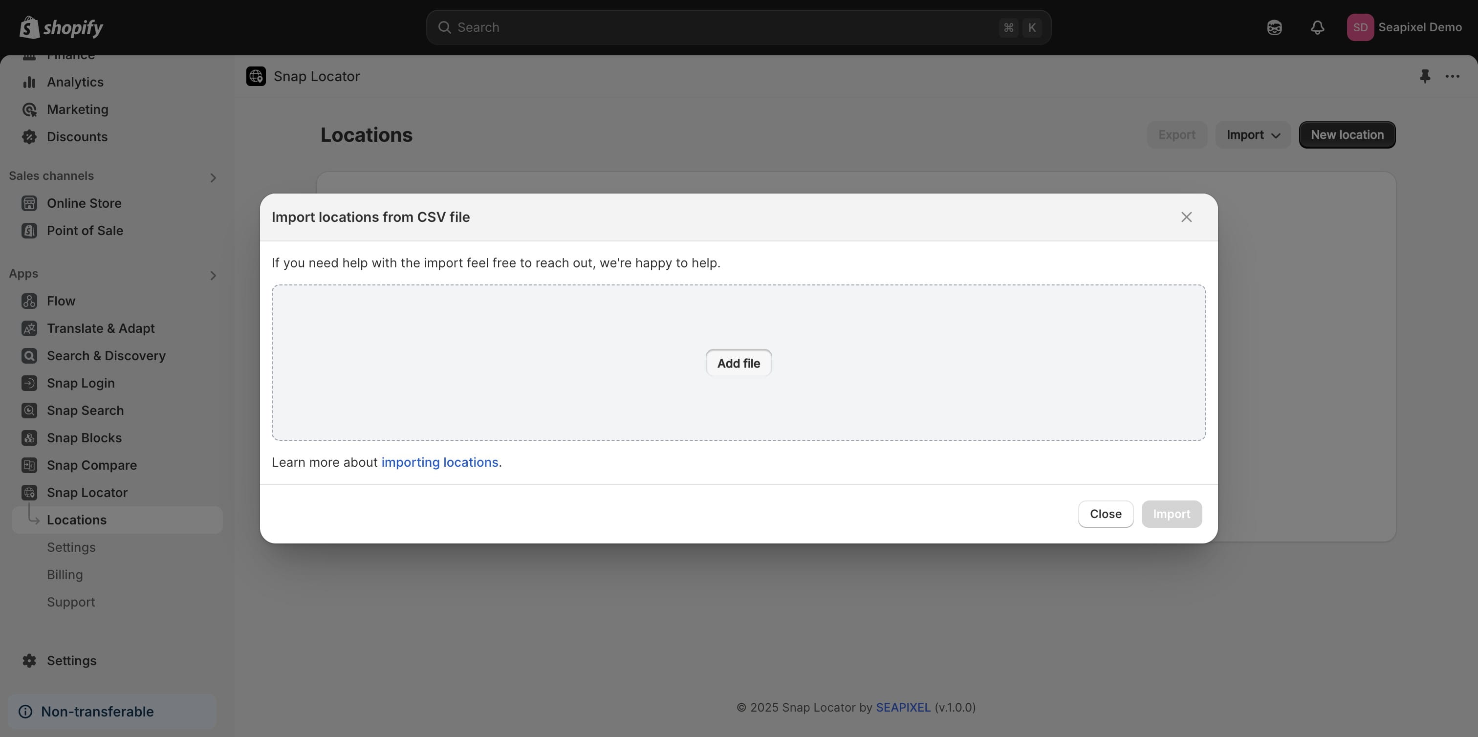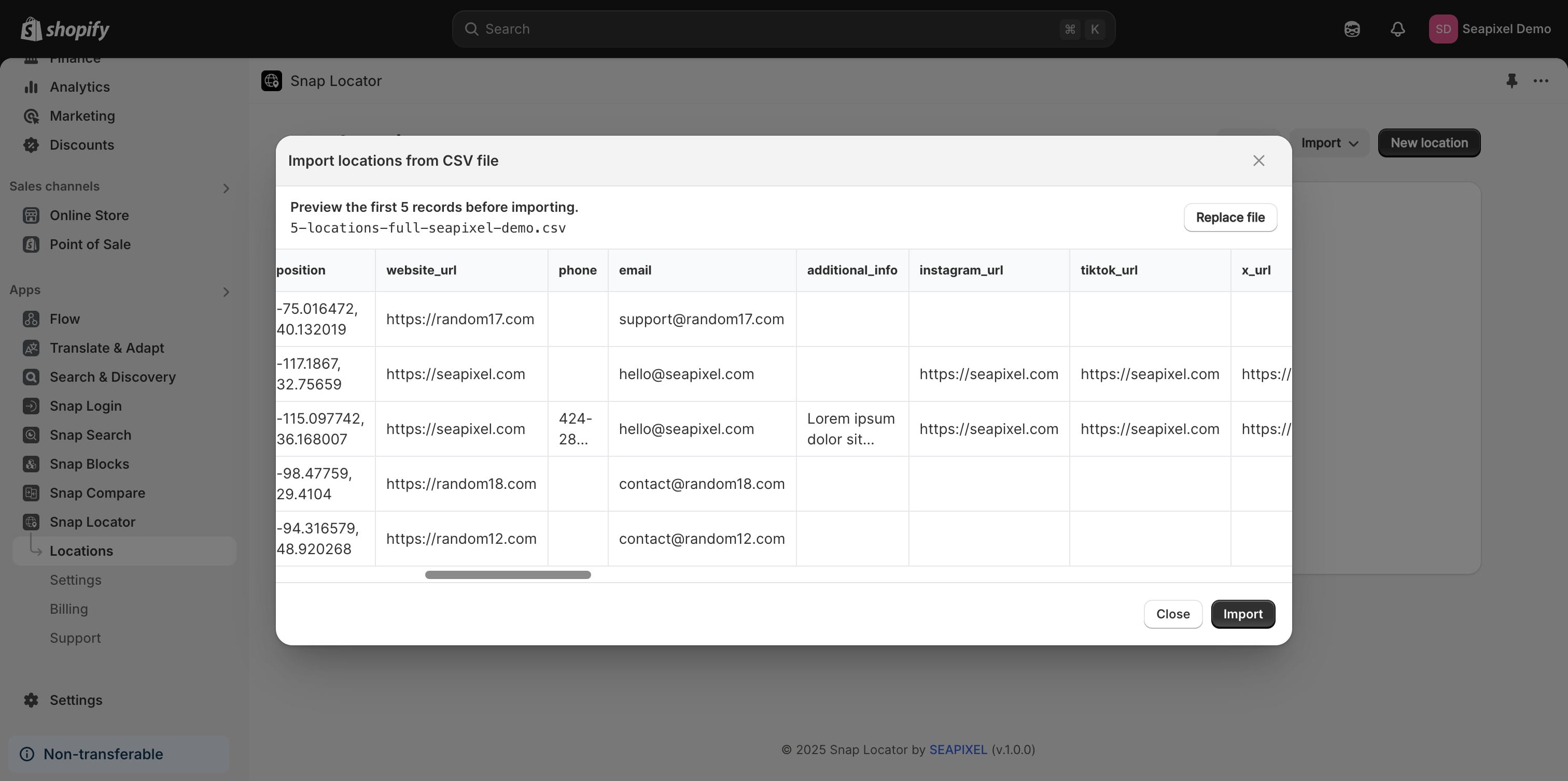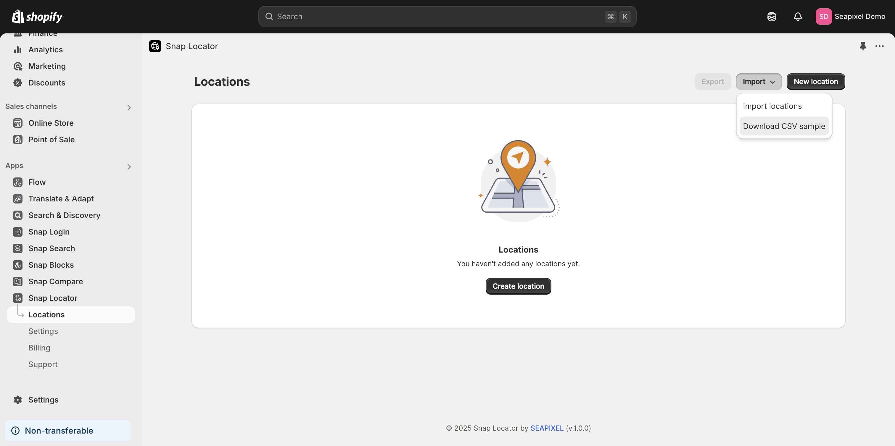 The CSV sample file provides the correct format and required fields for importing your location data. Using the sample ensures your data is properly structured for the Seasipxel Snap Locator app.